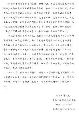 “老师的教导永远铭记在心,同学的笑声依然回荡耳边。疫情使我们不能做毕业的别离,但我们的心永远会在一起。希望我们341班的老师同学们都能乘风破浪,在未来的高点再次相遇,弥补毕业的遗憾!”