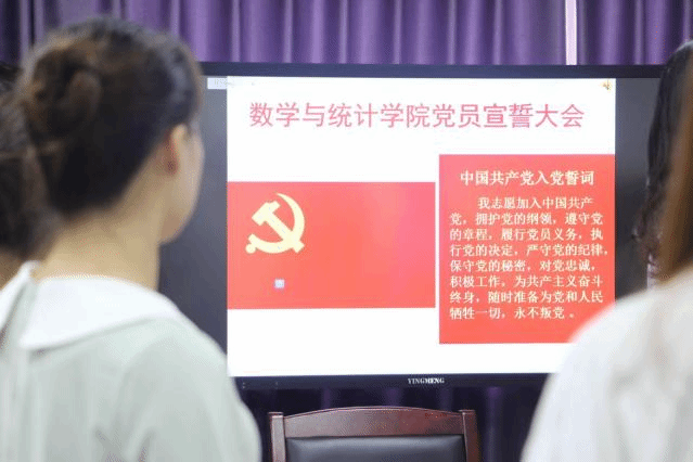 吴舒展宣布仪式开始,全体起立,奏唱《国际歌》。学生支部宣传委员崔芳宣布参加宣誓的新党员名单。宣誓仪式上,全体人员持立正姿势,右手握拳举过肩,面对党旗庄严宣誓。