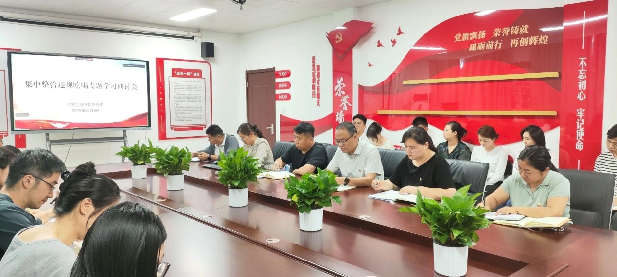 2025年6月19日,党委委员、副校长黄振中以普通党员身份参加信息工程学院党总支集中整治违规吃喝专题学习研讨会,并围绕集中整治违规吃喝问题与信息工程学院全体党员干部开展专题谈话。
