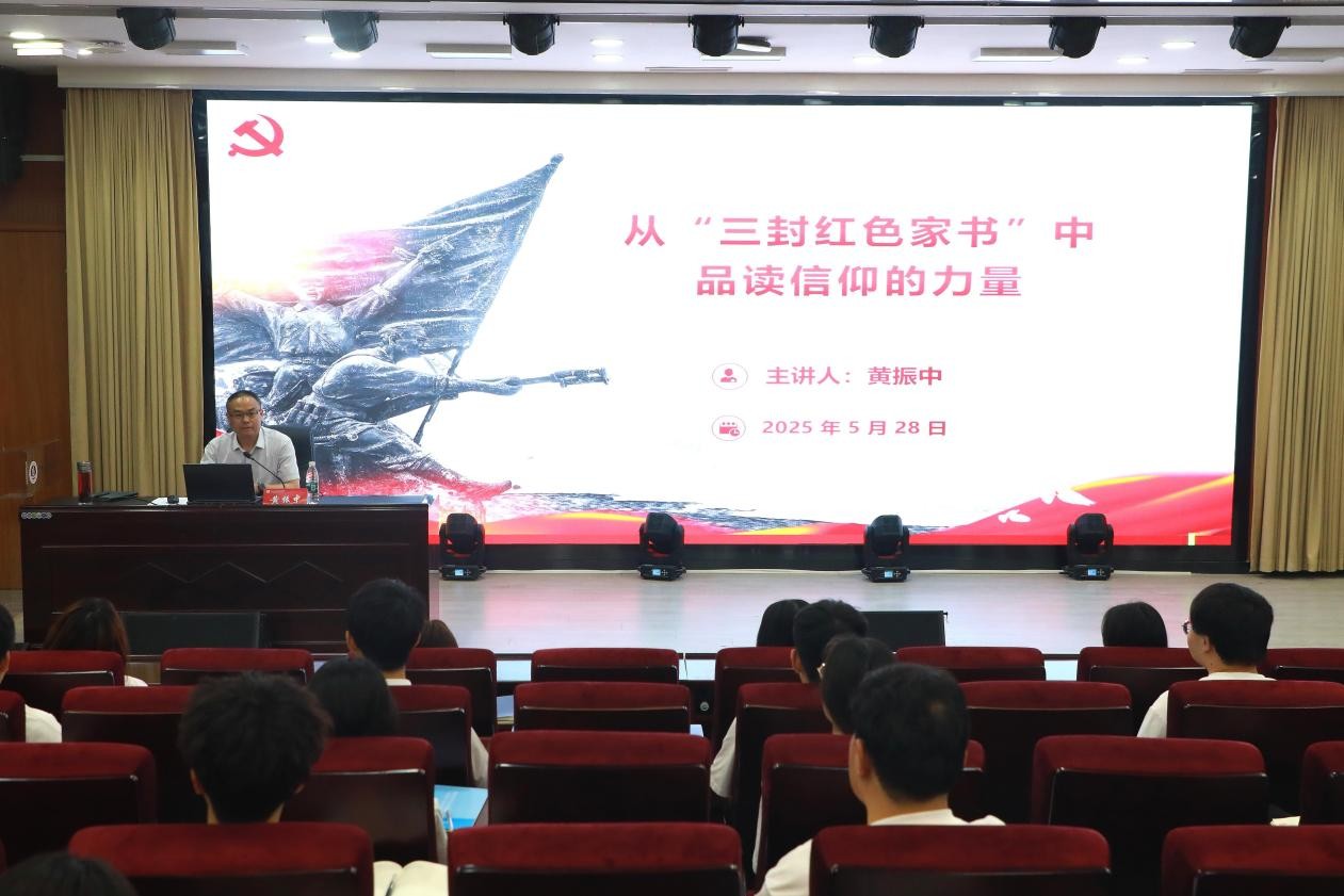 为深入学习贯彻习近平新时代中国特色社会主义思想,进一步激发青年学生的爱国情怀和历史使命感,2025年5月26日,副校长黄振中以“从‘三封红色家书’中品读信仰的力量”为专题,在郑州校区为信息工程学院学生讲授了一堂生动而深刻的思政课。