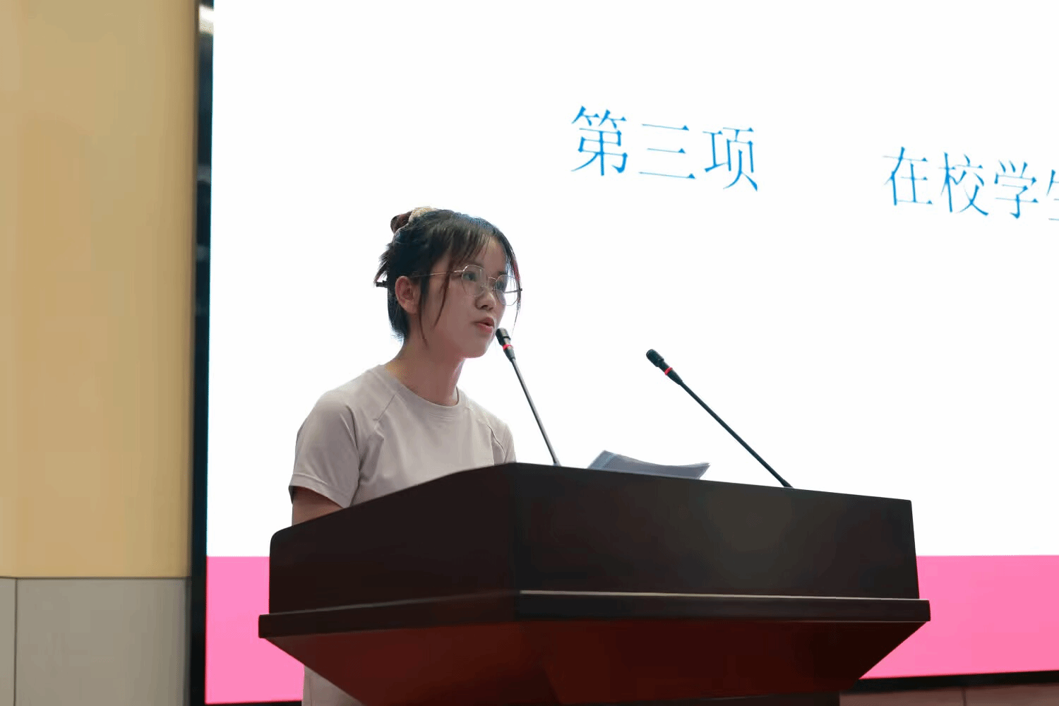 学生代表姚博文以“学姐”身份与新生交流。她分享了自己在学院的学习生活经验,从课堂学习、社团活动到学科竞赛,为新生提供实用建议,呼吁新生们尽快适应大学节奏,主动拥抱挑战,在数统学院的平台上实现自我突破。
