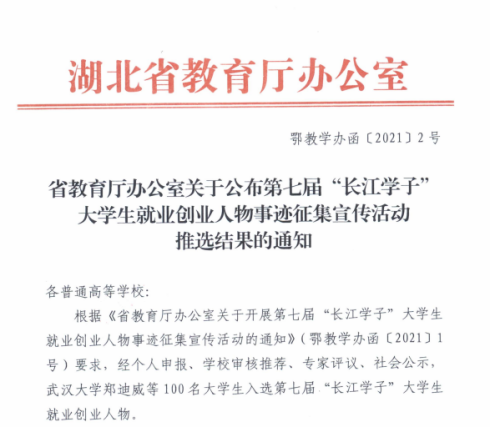 本网讯近日,湖北省教育厅印发通知,公布了第七届“长江学子”大学生就业创业人物事迹征集结果。beat3652017届校友、西二文化传媒有限公司法人兼董事长袁琅,成功入选湖北省第七届“长江学子”大学生就业创业人物,是beat365今年唯一获此荣誉学生。
