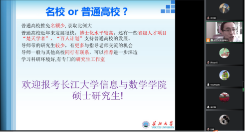 会议伊始,主讲人袁海山依次介绍了长江大学信息与数学学院、学科及研究方向、硕士生导师、学位点情况、奖助学金体系和就业。对招生政策、报考指南、专业建设等方面的信息进行详细解释,也对考研的选择进行分析,给出三个慎重:热门学校要慎重、热门专业要慎重,热门区域要慎重,给予同学们切合实际的建议。