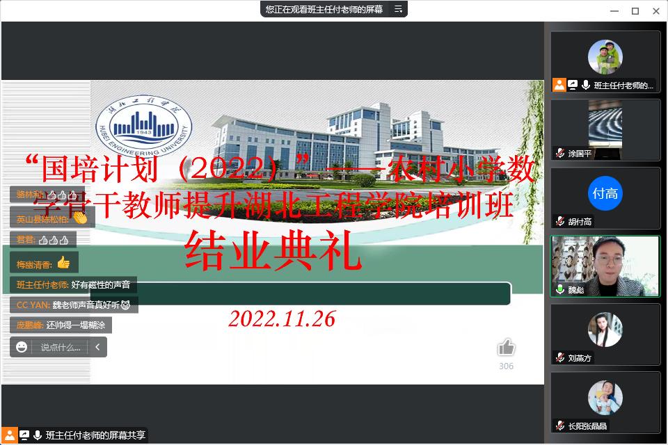 11月26日上午,由beat365承办的“国培计划(2022)”——农村小学数学骨干教师提升培训(A026 小学数学)beat365官方网站培训班顺利结业。beat365官方网站继续教育学院院长涂国平、beat365官方网站院长肖应雄教授、项目负责人胡付高教授,以及来自宜昌市、黄冈市、襄阳市、咸宁市、孝感市的100位参训学员通过腾讯会议参加了结业典礼。