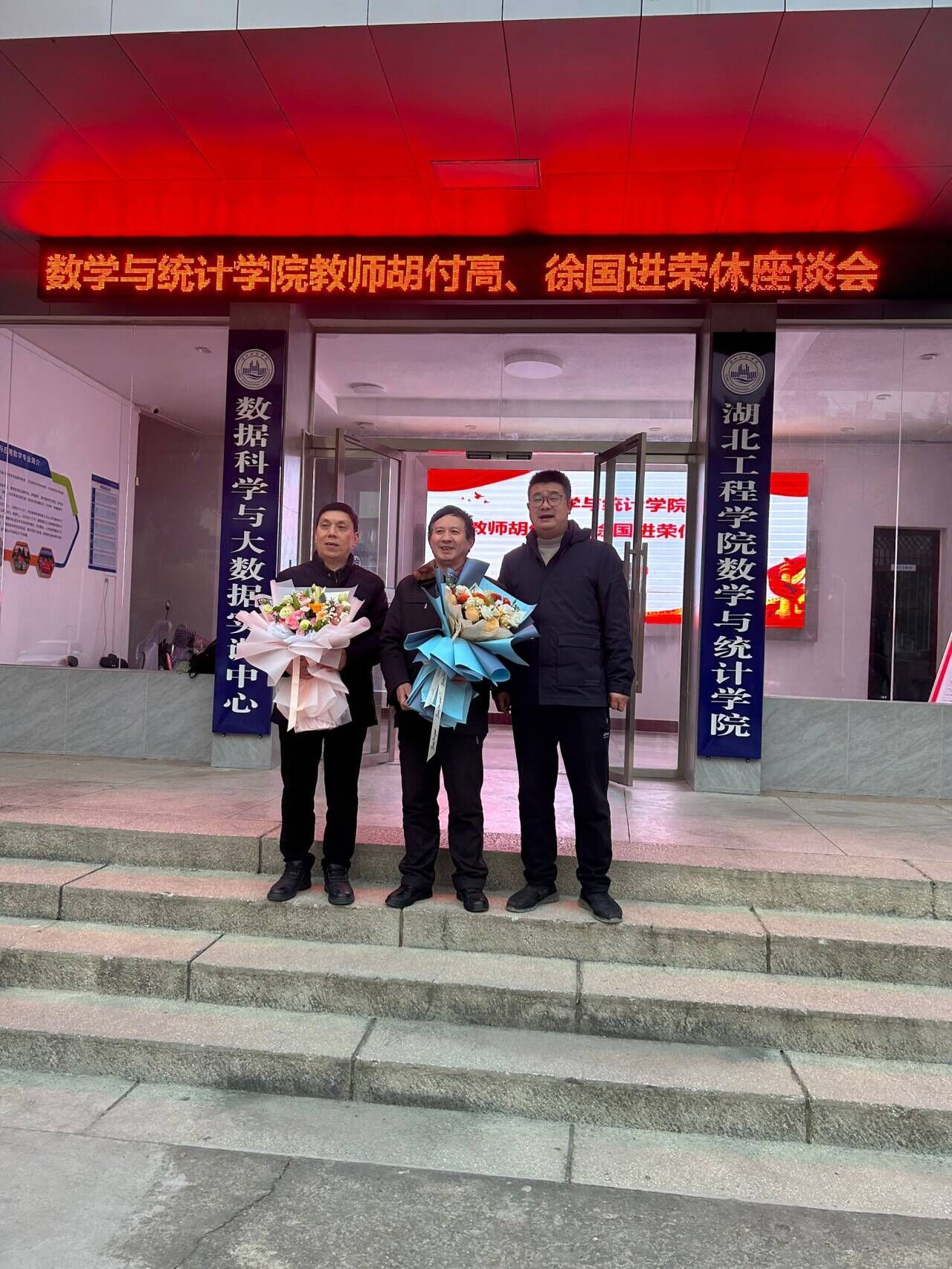 会议伊始,王书记简要回顾了胡付高、徐国进两位老师的工作经历,尤其是数十年如一日的为数统学院辛勤工作、呕心沥血,倾力完成各项工作任务,助力年轻同事的成长,深情表达了对两位老师的感谢与敬意。“每当走过老师的窗前........”伴随着音乐的响起,学院为胡付高、徐国进两位老师赠送鲜花和荣休纪念品。随后,院领导、教师代表依次发言,回忆了与两位老师一起工作的点点滴滴,表达了对两位荣休教师的感佩之情和美好祝福,言语间尽显对两位老师的依依不舍。两位荣休老师分别发言,深情回顾自己在数统学院工作、生活、奋斗的历程,感慨学院的发展与变化,他们表示今后会继续关注学校、学院的发展,发挥余热、贡献力量。