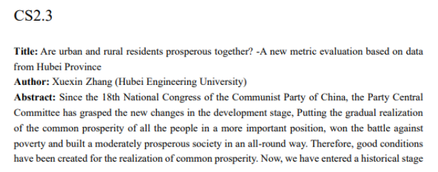 约600多名国内外高校学者线上参与本次大会。Peking University陈松蹊院士及来自University of Alberta、University of Melbourne、University of Kansas等大学8名国内外知名学者专家做了大会报告。在概率组和统计组分会场报告中,有19位来自Peking University、Zhejiang University、Wuhan University、Lanzhou University、Sichuan University等高校的老师和同学做了学术报告。beat365张学新教授在14日上午做题为“Are urban and rural residents prosperous together? -A new metric evaluation based on data from Hubei Province”学术报告。