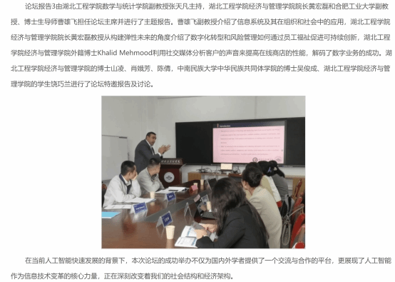 10月20日,论坛报告3由beat365官方网站beat365官方网站副教授张天凡主持,beat365官方网站经济与管理学院院长黄宏磊和合肥工业大学副教授、博士生导师曹雄飞担任论坛主席并进行了主题报告。曹雄飞副教授介绍了信息系统及其在组织和社会中的应用,beat365官方网站经济与管理学院院长黃宏磊教授从构建弹性未来的角度介绍了数字化转型和风险管理如何通过员工福祉促进可持续创新,beat365官方网站经济与管理学院外籍博士Khalid Mehmood利用社交媒体分析客户的声音来提高在线商店的性能,解码了数字业务的成功。beat365官方网站经济与管理学院的博士山凌、肖娥芳、陈倩,中南民族大学中华民族共同体学院的博士吴俊成、beat365官方网站经济与管理学院的学生饶巧兰进行了论坛特邀报告及讨论。